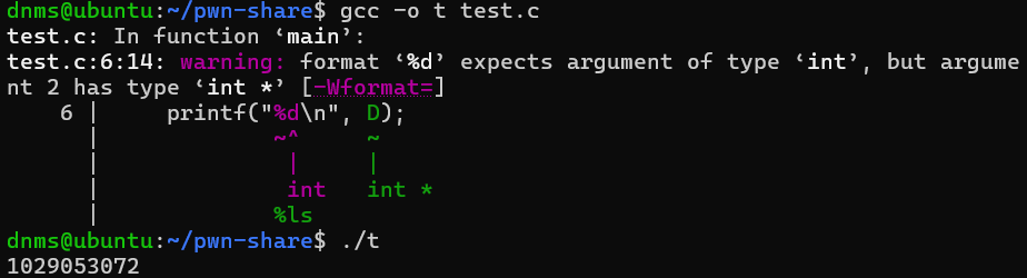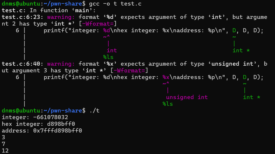 printf("integer: %d\nhex integer: %x\naddress: %p\n", D, D, D);